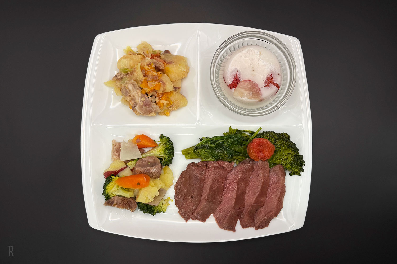 松阪牛、ブロッコリー、さつまいも、かぼちゃ、ジャガイモ、にんじん、大根、トマト、だし(利尻昆布、鰹節)、馬ヘレ、水菜、米粉ニョッキ、山羊ミルク、ヤギミルク、いちご